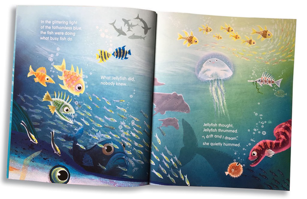 “(t)his is a sweet and captivating bed-time story. The language is rich and evocative of the deep blue sea, and the illustrations are absolutely stunning.(…) I Am Jellyfish has a beautiful rhyme and rhythm that begs you to read it aloud. Not only does it sound great read aloud, it has a gorgeous storyline where Jellyfish learns of her own ability.”
