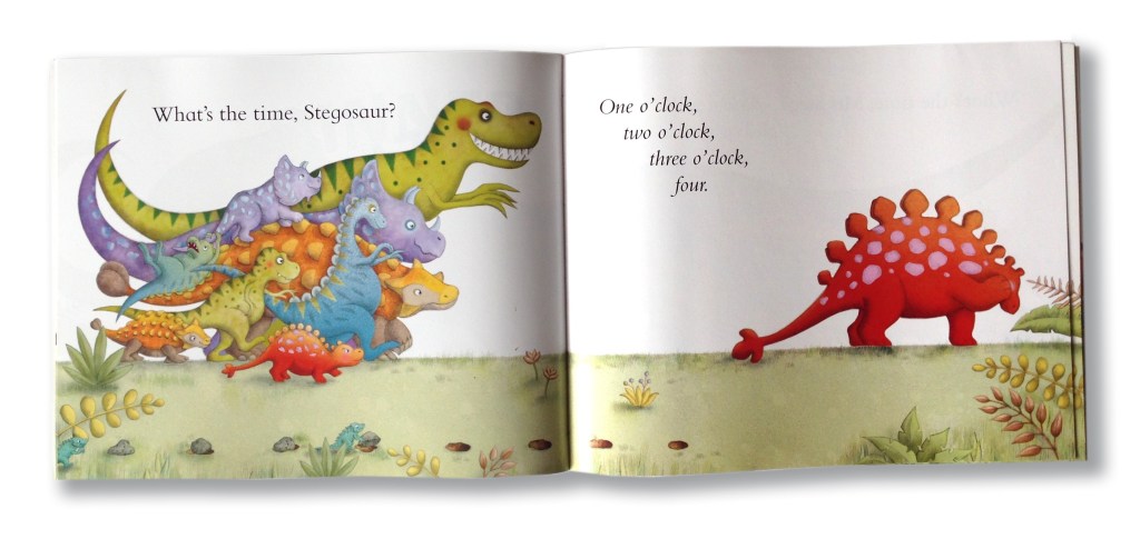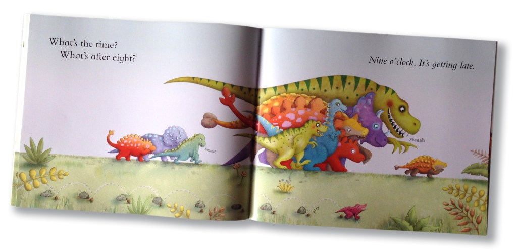 Remember playing What’s the Time Mr Wolf? Well, here it is with cheating dinosaurs. Count down to bedtime with the dinosaurs as they tiptoe, stretch, run and ROAR their way through this much-loved playground game. It ends at bedtime, but I can’t promise the little dinosaurs will be sleepy.
